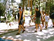 当地做生意的人们注意到:每天我们放好真相展板时,马上就有两个小松鼠从树上跳过来玩耍,一个人说:可能这里有一个非常好的能量场,否则这两个可爱的小动物不会连续两天都来这里玩耍的。