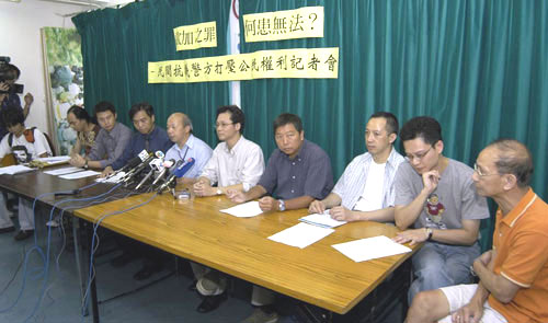 【明慧网2002年8月21日】香港七个民间、人权及政治团体,包括香港人权联委会、香港人权监察、民主党、前线、街坊工坊服务处、香港职工会联盟及四五行动等代表,8月20日召开「民间抗议警方打压公民权利记者会──欲加之罪、何患无法?」。他们指警方利用连串粗暴及野蛮的方式,干扰市民进行和平请愿及集会活动等,指责警方滥用权力,阻止市民行使公民权利。他们同时批评警方屡次透过在法律条文中钻空子,甚至以毫不相关的法例,如以检控小贩的「阻街罪」检控和平请愿的法轮功学员,藉此打压请愿及示威人士,又以所谓「依法办事」的借口蒙骗市民,企图进一步收紧香港的自由空间。