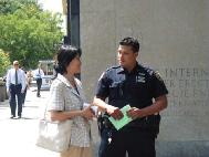 新闻发布会期间,学员们手持横幅发正念并演示了功法。学员们向过往的行人和执勤警察讲述柬埔寨事件和中国江泽民政府迫害法轮功的真相,并递上真相资料和光盘。