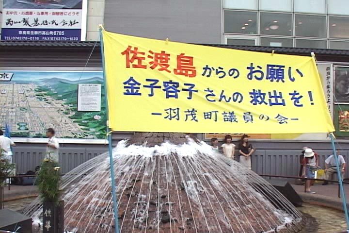 | 营救金子容子呼吁大家签名的海报 | 横幅上写着“来自佐渡岛的请求∶救出金子容子女士!――羽茂町议员会” | 民主党党首,鸠山由纪夫签名支持营救金子容子女士 |