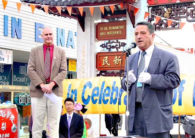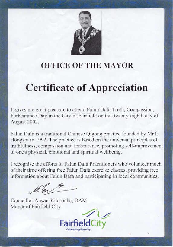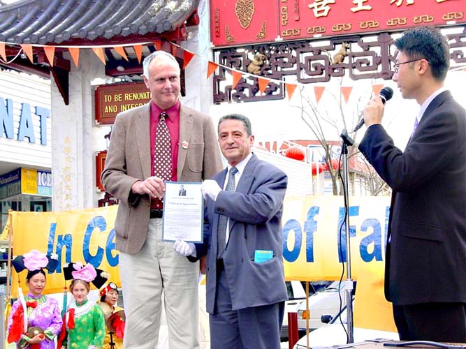 上午11点半,费菲市市长、议员和澳洲杰出贡献奖得主(OAM)Mr. Anwar Khoshaba到场为法轮大法真善忍日揭幕剪彩。市长双手拿着大法简介作了讲话:“今天很高兴参加法轮大法日庆祝活动。费菲市政府永远支持法轮大法。在市政厅的年历上,今天是一个大日子。我们是一个多元文化的社团,你我一起分享自己的文化、自由、信仰和宗教等。我百分之百支持法轮大法,法轮大法庆祝活动,每次我都将乐意出席参加。”在热烈的掌声中,Mr. Anwar Khoshaba给法轮大法赠送了褒奖证书。小弟子给市长献了鲜花致谢。