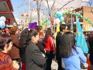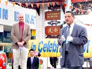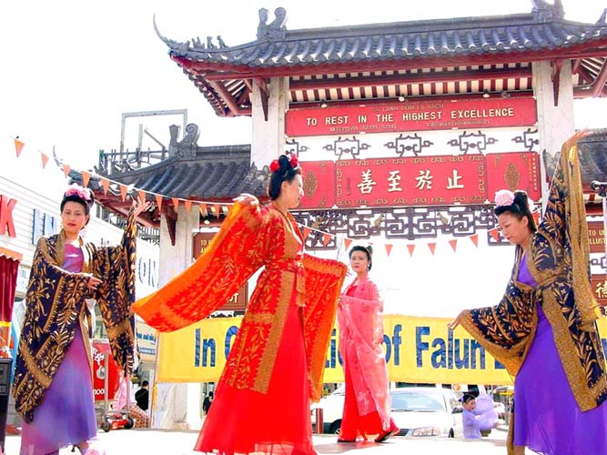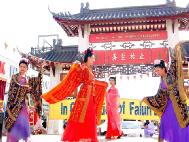 牌楼前,大法弟子搭起了简易舞台,舞台后方悬挂着大型英文横幅“庆祝法轮大法日”,舞台两侧的“法轮大法”、“真、善、忍”彩旗迎风招展。空中飞舞着硕大的彩色汽球束,更是舞台的最好装饰。在舞台的另一端,是大法资料信息台、中文书籍台、中文书法展示台及摆放着大法在世界洪传盛况和受到褒奖的大型展板。