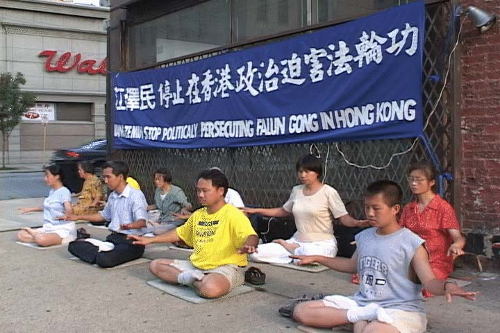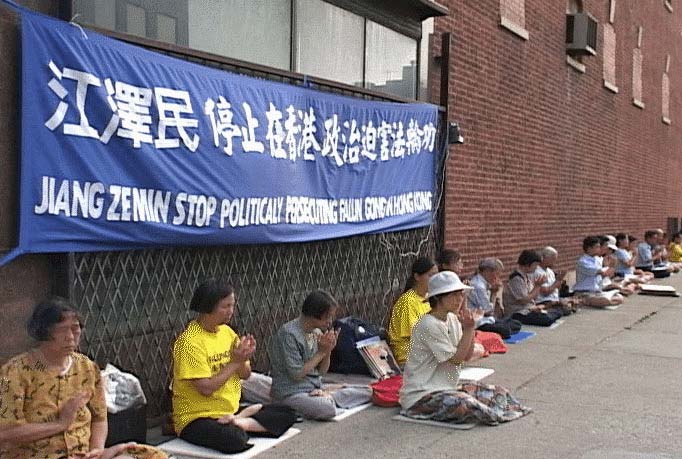 8月4日下午,芝加哥法轮功学员来到中国驻芝加哥领事馆前举行集会,抗议江泽民一伙在香港对法轮功学员进行的政治迫害。