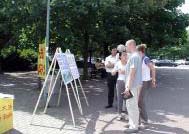 | 市政厅前广场祥和的炼功场面 | 学员深入地给行人讲清真相 | |