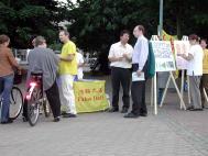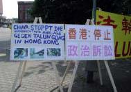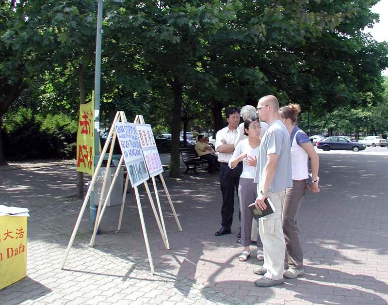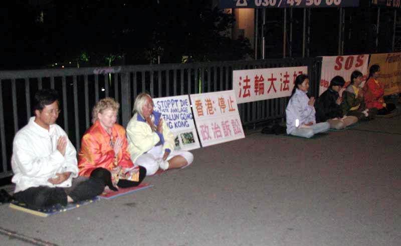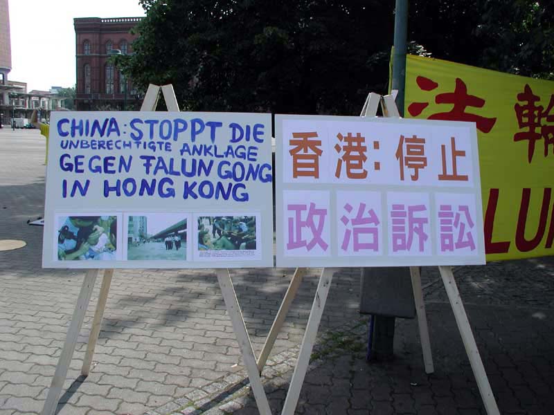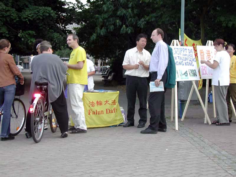 柏林市政厅前的广场是柏林的旅游景点之一,今天来往的游客特别多,而且特别广,从我们手中得到真相资料的几乎有来自欧洲各国的有缘人,学员祥和的炼功场面吸引了不少游客驻足观望。张贴着港警暴力对待法轮功学员照片和呼吁终止香港对法轮功学员的政治起诉的展板也引起了很多过往行人的关注。学员抓住机会深入地给行人讲清真相,揭露江泽民集团企图将邪恶迫害继续延伸到西方民主国家。行人在明白真相后都表达出对江泽民集团的邪恶镇压和其新的邪恶企图的愤怒,并对我们和平的呼吁表示敬佩和支持,许多行人都认为,邪恶的镇压将不会再存在多久了,正义终将战胜邪恶,他们真心祝我们成功。