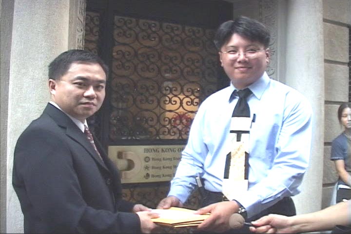 随后法轮功学员代表向办事处递交了请愿信。在法庭没有达成最后结论的情况下,香港驻纽约经济贸易办事处副主任宣读了一份声明,坚持香港警方诬告的言辞,由此人们看到香港的法制已经在短短时间内被大陆独裁者祸害到了何等不堪的地步。