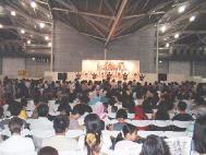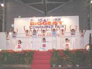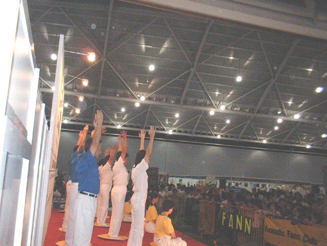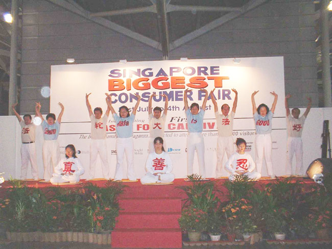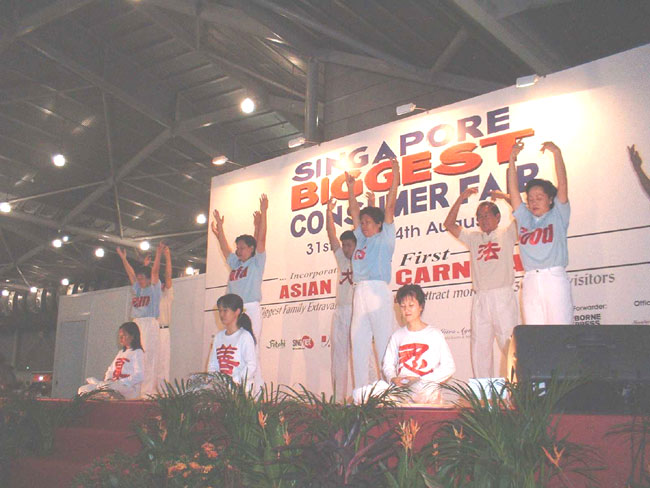 在这次嘉年华会上,参展单位可要求在表演台上做宣传,每个时段为半小时,法轮功获得了在展厅中心的表演台上向参观者演示功法的好机会。五天内,学员们先后九次登上演示台,堂堂正正地向台下的观众演示法轮功的五套功法。每次表演开始前,大会主持人都会用中英文为观众介绍一番:“接下来大家将会看到法轮功学员的表演,法轮功也叫法轮修炼大法,已经吸引了全世界上亿人修炼。1996年,法轮功在新加坡就合法注册。任何人都可以炼法轮功。法轮功不是宗教。”随后,参加演示的学员依次上台,十二名大法弟子身着印有彩色字样的炼功服,在台上组成了流动横幅:“法轮大法好”, “Falun Dafa Is Good”,“真、善、忍”。耀眼的衣衫和学员们祥和的神情立时吸引了台下观众的注意力,有的顾客正在走路也停了下来静静地观看。接着,音乐响起,传来师父的声音:“第一套功法,佛展千手。”这声音响彻展厅……