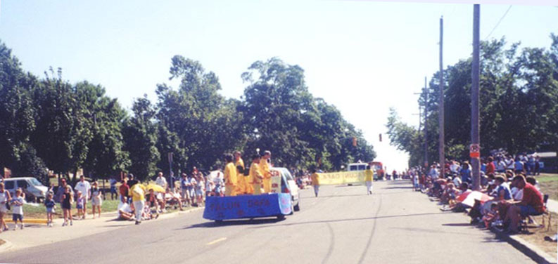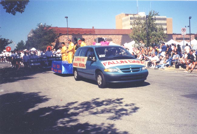 在三天的活动中,学员们顶着酷暑烈日,一遍一遍地演示着五套功法,向过往的行人派发法轮功的介绍资料。庆祝活动的高潮是七日的大游行。当日上午晴空万里,学员们早早地来到集合地点,齐心协力地装扮好了彩车以后,正好是游行开始的时间。彩车随着二位手举“法轮大法”、“真善忍”横幅的学员,在祥和的普度济世音乐声中缓缓移动,身着黄色炼功服的学员们将五套功法展示给层层叠叠地坐在道路两边的观众,所到之处不时地赢来人们的热烈掌声。车上的小弟子们不停地向人群挥手致意,人们也微笑着向他们致意。游行过程中学员们派发了很多资料。