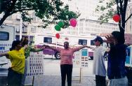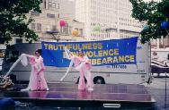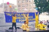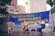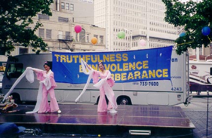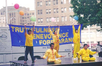 为庆祝首届新泽西州艾塞克斯县“真善忍日”,法轮功学员为艾塞克斯县的人民准备了精彩的节目表演。来自纽约的学员首先表演了精彩的狮子舞和优美的莲花舞,专程从康州赶来的女学员为观众表演了婀娜多姿的彩云飞天舞,台湾来的学员表演了刚柔结合的中国武术,新州的学员用他们精湛的演技为纽观众们表演了长笛大提琴三重奏,学员们精彩的表演赢得了观众们一次又一次的掌声。接着学员们又为观众们表演了法轮功五套功法,观众们被这优美的功法深深地吸引住了,一些观众还情不自禁地在台下跟着炼了起来。为了满足观众们的要求,学员们临时在一旁设立了一个教功点。
