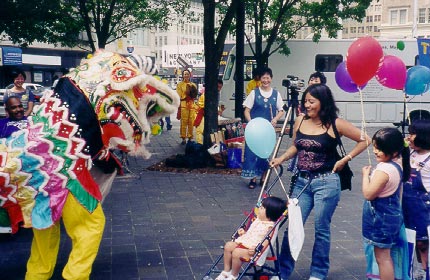 不少市民都到法轮功的摊位来打听哪有炼功点,一位华人老人也专程赶来寻问在哪可以学功。另外,学员们还设置了一个书法表演摊位和一个手工艺摊位为市民书写“真善忍”和展示精美的自制手工艺品。