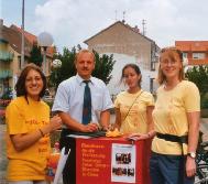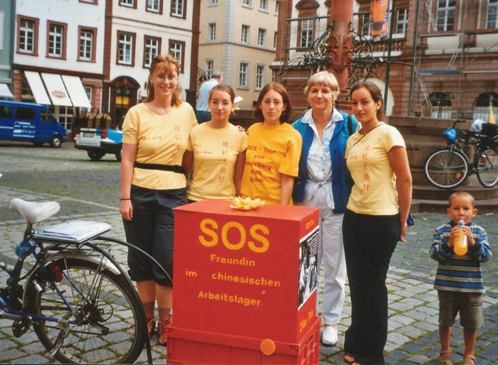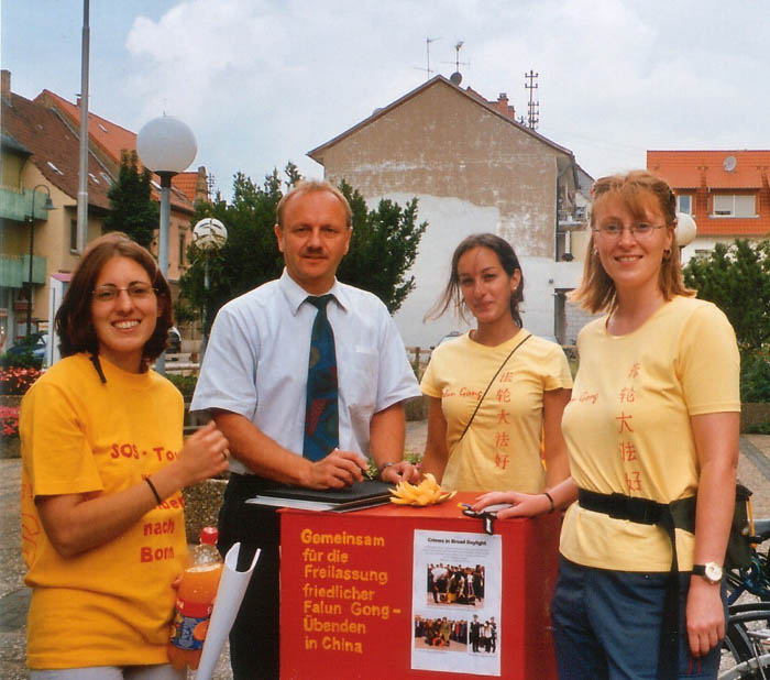 一个城市,在已经关门的市政厅前面与一位老先生交谈时,从市政厅里走出来了另一位先生。看来他有兴趣知道,这四个带着引人注目的标志的女孩子要在这里干什么。在谈话中我们才发现他就是市长。他非常友好,并在我们给德国政府的呼吁信上签了字。在信中我们呼吁德国政府为帮助释放熊伟和停止对其他法轮功学员的迫害而尽力,