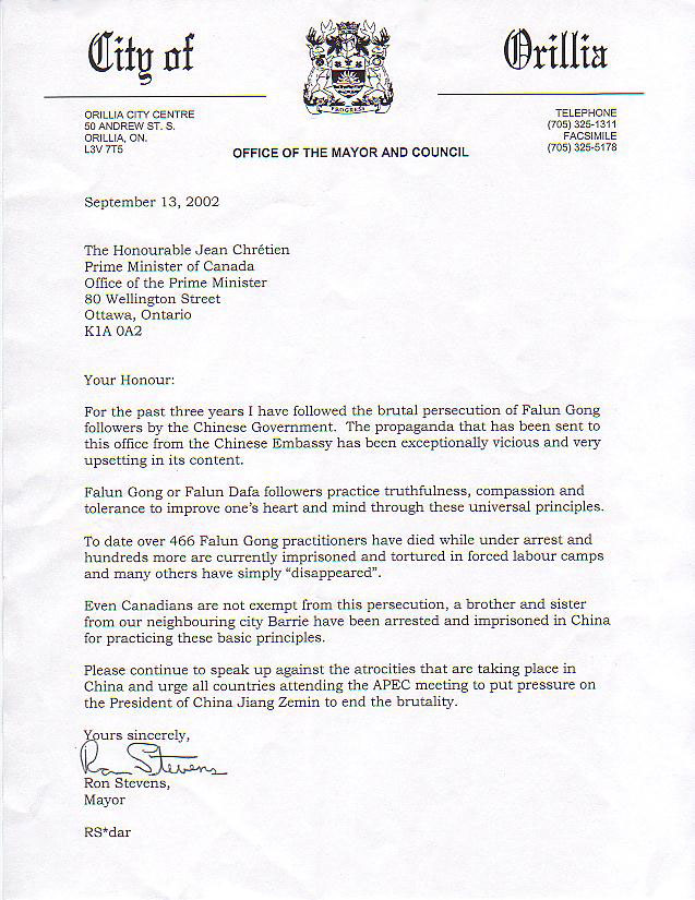 尊敬的克雷蒂安总理阁下: