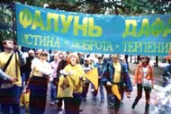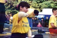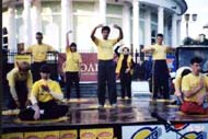 当我们参加游行时,出现了一个令人高兴和惊奇的场面,一家剧院彩排厅里,一大群孩子在口令下齐声高喊:“法轮大法好!”孩子们的喊声震撼了在场的所有人。游行后,根据活动安排,大法弟子还介绍了自己修炼后的身心变化,并集体炼功。在这一过程中,喧闹的人群静了下来,表演台前一片宁静祥和。甚至连绵细雨也停了下来。台前还摆放了我们的真相展板。