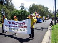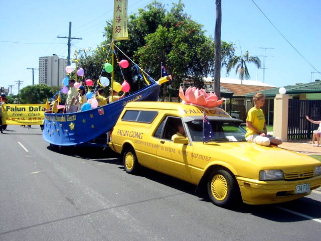 在历时45分钟的从Palm海滩到Currumbin北部的游行过程中,游行队伍徐徐前进,向沿途数百观众展现了大法的光彩和威严。在树荫下大法信息台服务的学员向热情的民众发送传单,并演示功法。
