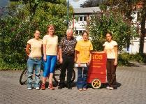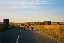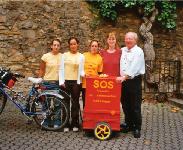 我们行进在一个居民稀少的地区,在一个农庄附近我姐姐自行车的链子掉了。当我们费了九牛二虎之力重新上好链子之后,去农庄问可否在那里洗一下满是油污的手,女主人马上很热情地同意,男主人也注意到了我们黄色的“SOS”T恤衫。当他听了我们为什么旅行时,马上把电话打到了我们下一站城市市长的家里,为我们预约了第二天见面的时间。