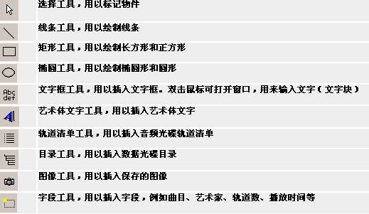 按“确认”后出现空文挡,如只想做光盘贴,在文档下方的标签中,直接选最后一项“光碟”,如英文版为“label”,则出现空白光盘贴。注意在文档窗口的左侧有一竖列工具图标。下面挑主要的进行介绍。