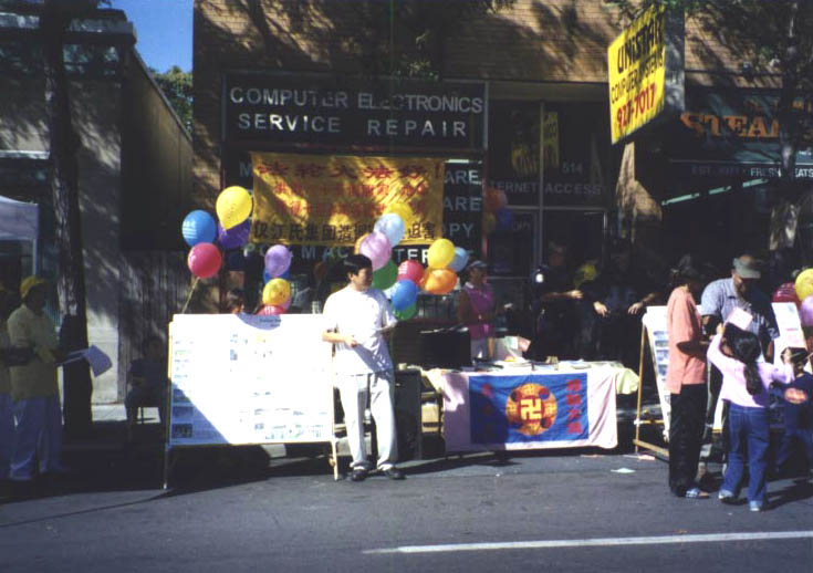 今天是难得的好天气,法轮功学员今年是第四度参加这个活动,大家一大早就把展位,展板,资料安排得井井有条,等待着游行的开始,并不失机会向过往行人介绍法轮大法。