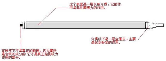 首先我们说明一点,对于刮板的,有人说是它的毛病,其实,那是很小的损伤,真正的损伤是硒鼓的“心脏”——“导墨磁棒”。我们把鼓分体后在装粉的仓一侧有个“磁棒”。它是负责把墨粉从粉盒传导到鼓芯。大家可以观察一下废鼓,我们会发现磁棒的表面有一条条的刮痕,我们可以对比一下正好是纸张脏的地方。为什么会这样呢?下面我们讲一讲磁棒的结构与原理。