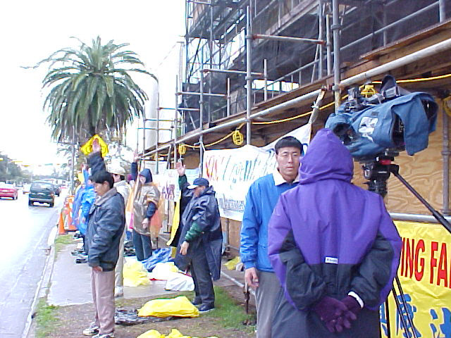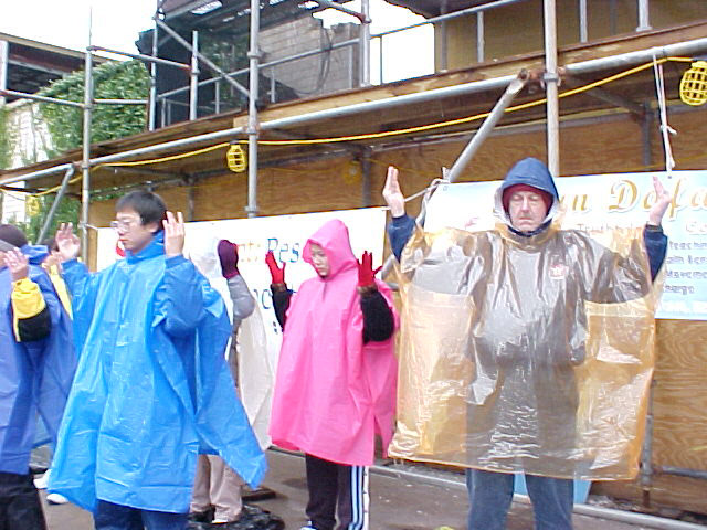 今天,风雨交加,一切活动均在雨中进行。英文39电视台采访人员现场采访学员及摄影,新!唐!人:电视台记者也现场采访,学员通过媒体呼吁国际社会和中方有关责任单位对这些迫害事实给予重视,对案例进行严肃调查。江泽民是发起和推动这场信仰迫害运动的元凶。江泽民因群体灭绝罪在美国联邦法院被起诉,大法学员要求依法严惩血债者,要求中国停止虐杀大法学员,终止江泽民犯罪集团三年以来对大法及大法学员的迫害。