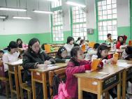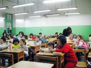 「中低年级班」学生人数则较多,上起课来非常热闹活泼。有些年纪较小的学生还需要家长陪着一齐学法。