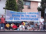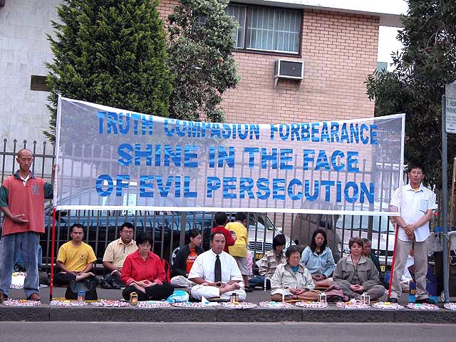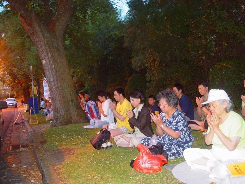 大约五十名支持者在位于圣乔治街的领事馆外面的人行道边盘腿静坐抗议,自去年11月起在中国有四十三名法轮功学员的死亡被报导。静坐活动从上午九点开始至晚上八点结束,今、明两日在美国和加拿大各地继续进行,加拿大城市还包括渥太华、卡尔加利、温哥华等。