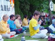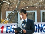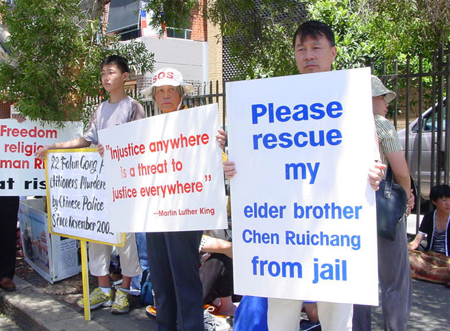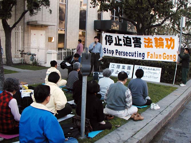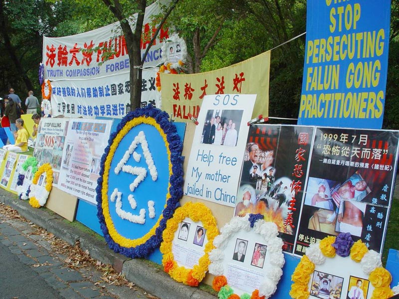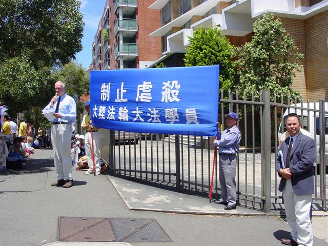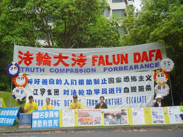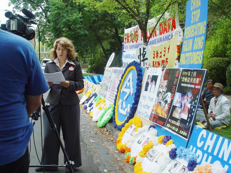 报导说由法轮功学员们发起的这项抗议在全世界各地展开,稍前,法轮功信息中心说自去年11月以来有43名学员被中国当局谋杀并公布了详情。本地的法轮功学员安德里娅-哈利宣读了一份声明,她呼吁江停止暴力镇压热爱和平的人们。