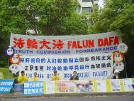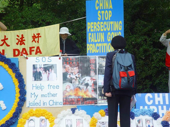 学员们的和平抗议活动引来不少路人的关注与支持,他们中有华人,日本人,西方人。他们有的说:“法轮功好!” 有的说:“保重。”还有人说:“谢谢。” 一对中年日本夫妇对学员说:“我们知道在中国不许炼法轮功,你们要保重啊。”一位来自上海的老先生说:“江XX就是坏。”