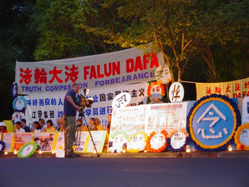 入夜,盏盏烛光沿街点燃.。9点请愿活动结束.。一位姓黄的女学员表示,全球三天的抗议活动虽然结束了,但是我们要求制止江XX迫害法轮功的活动还会以各种和平方式继续进行。