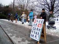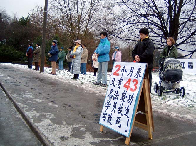 【明慧网2003年1月15日】2003年1月13日,为抗议江泽民政府对中国大陆法轮功学员的“群体灭绝”的暴行,德国西部大法弟子冒着严寒和大雪聚集在中国驻波恩领事馆前,进行了和平的抗议活动。