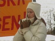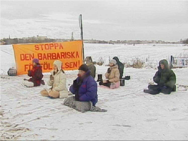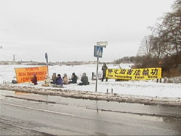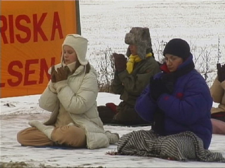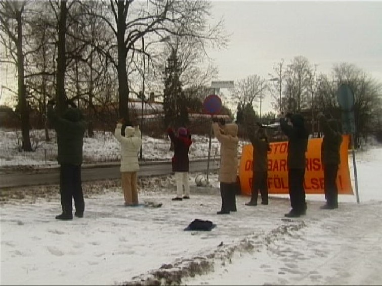 瑞典斯德哥尔摩大法弟子于2003年1月12日20时30分开始,在中使馆前进行了为期三天的呼吁国际社会共同制止中国江氏集团的暴行的炼功请愿活动。图为14日上午部分学员冒着凛冽的狂风在雪地里进行炼功的情景。