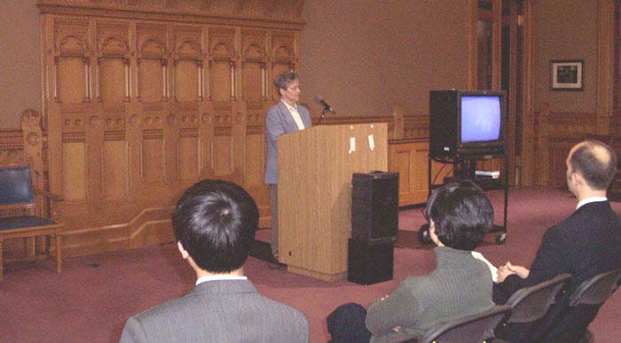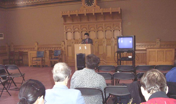 【明慧网2003年1月17日】2003年1月13日,美国康州法轮功学员在州政府办公楼召开新闻发布会与正法之路图片展,呼吁社会各界帮助制止中国江泽民集团对法轮功学员的虐杀,并告知世人中国的邪恶独裁者江泽民因群体灭绝罪在美国被起诉。招待会最后播放了真相录像片。