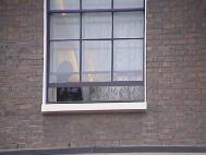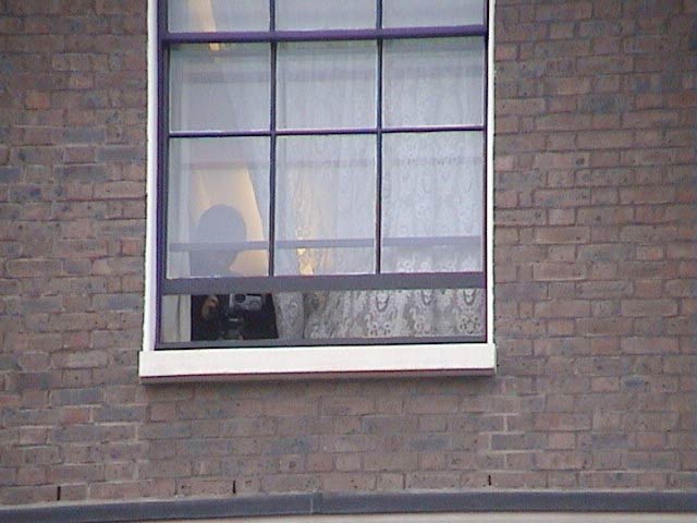 但在这次和平请愿的新闻发布会期间,中使馆一反常态,没有制造噪音进行干扰,一直非常安静。学员们心中也希望使馆人员停止作恶,停止迫害善良。但无意间,一名学员发现使馆大楼的一面窗户后面似乎人影幢幢,若隐若现,有些鬼鬼祟祟的异样感觉。学员立即拿起摄像机对准窗户,放大焦距,定睛瞧看:原来使馆一个工作人员正躲在窗后偷偷拍录对面参加和平请愿的法轮功学员。