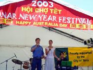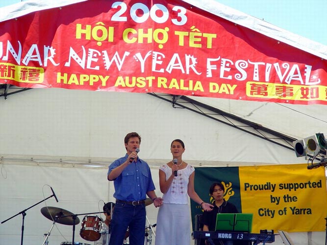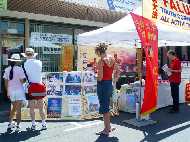 在人山人海的摊位前,墨尔本大法弟子们送出了大量的资料和光盘,有些经过的中国人惊奇地指着我们的摊位说:“快看,法轮功啊!”,也有很多中国人主动前来索取资料。明慧学校小弟子们的功法演示特别引起小观众的兴趣。当地的媒体也前来采访了大法弟子。