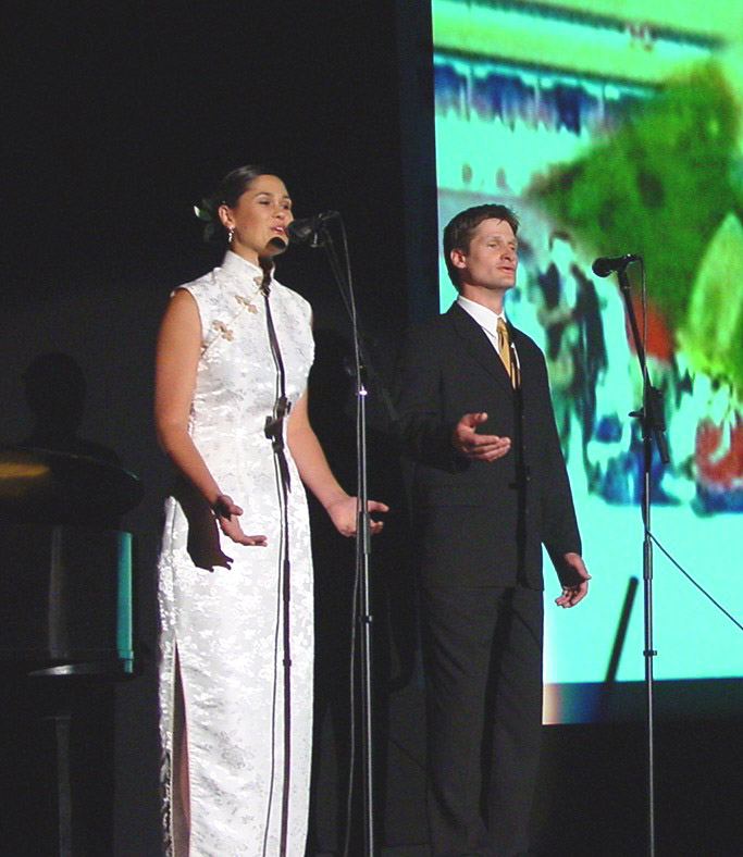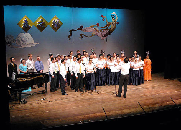 器乐合奏一曲“春天”,以磅礴的气势,拉开了晚会的序幕。精彩的文艺表演,博得全场观众的阵阵热烈掌声。尤其是来自墨尔本的于2001年10月曾去过天安门广场和平请愿的西人夫妻法轮功学员,以二重唱形式西人中唱“为你而来”时,使观众无不感动,掌声迭起。最后“同颂音乐艺术团”全体演员,和法轮功之友会参演人员组成的40人大合唱“法轮大法好”,将文艺晚会再次推向高潮,演出在“法轮大法好、法轮大法是正法,佛光普照”歌声中圆满结束。