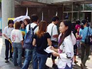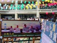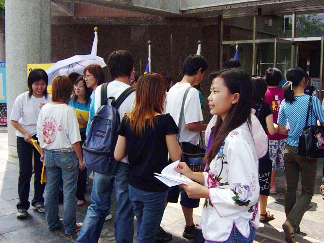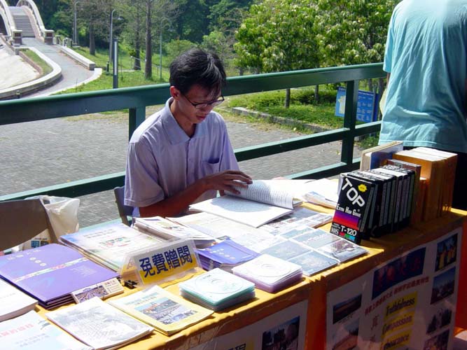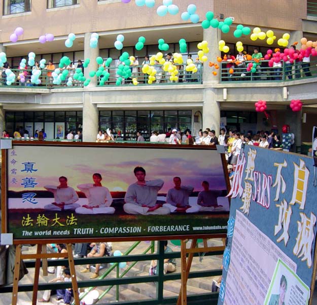 两天的社团联展在嘉义地区青年学子的互相帮忙下,活动从容地落幕,然而在这之前,发生了一个小插曲。由于同修的疏忽,延误了活动的报名时间,但是学员们心里都很清楚,这是让学校同学正面认识大法的好机会,无论如何都要把握住,所以讨论之后,抱著纯正的心态和正念去和主办单位商量,没想到真的行,而且不但行,活动当天大法社团的场地竟是最大的。当学员炼功的图片一摆出来,马上就为这个场注入了光明、祥和的气氛。