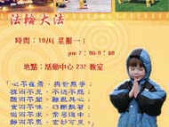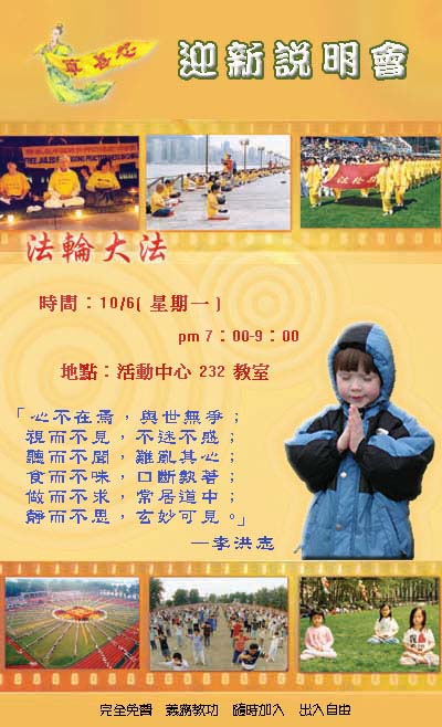 每年开学不久后,中正大学法轮大法社团必定会举办迎新说明会。长久以来,社团的同学们有一个共识,不管说明会来的人多或少,这个说明会一定要延续下去,因为藉着宣传活动的过程,至少可以让同学们知道学校有法轮大法社团的存在,只要同学们想学炼法轮功,就有一个便利的条件。