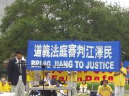 活动中安排一个审判江泽民的模拟法庭,法官、律师等均由当地法轮功学员扮演,而被告江泽民的扮演者则是一个木偶。