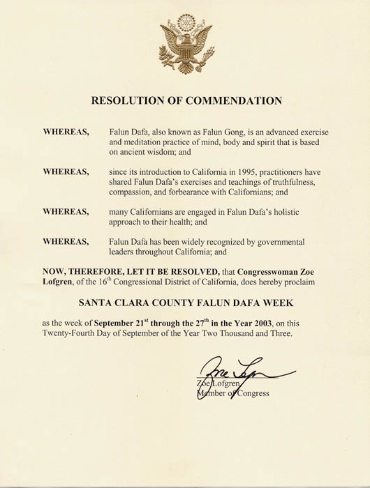 鉴于,法轮大法已经得到了加州上下政府领导人的广泛认同;