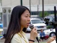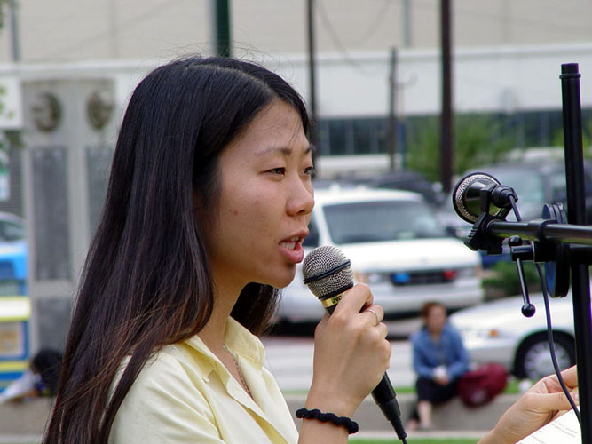| 集体炼功 | 德州大学的学生王晓丹在发言 |