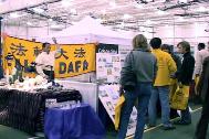 一位白人男青年对法轮功的功法问了许多问题。当他听到法轮功五套功法简单易学,修炼者普遍身心健康,他显出极大的兴趣,连连点头。当他得知在密西根每周都有若干个教功点,他终于忍不住,提出了他的关键问题:「多少钱?」学员回答说:「免费。」「免费!?」年轻人简直不敢相信自己的耳朵。的确,在大厅里参展的几百个展位中,除了法轮功,哪有免费这回事。