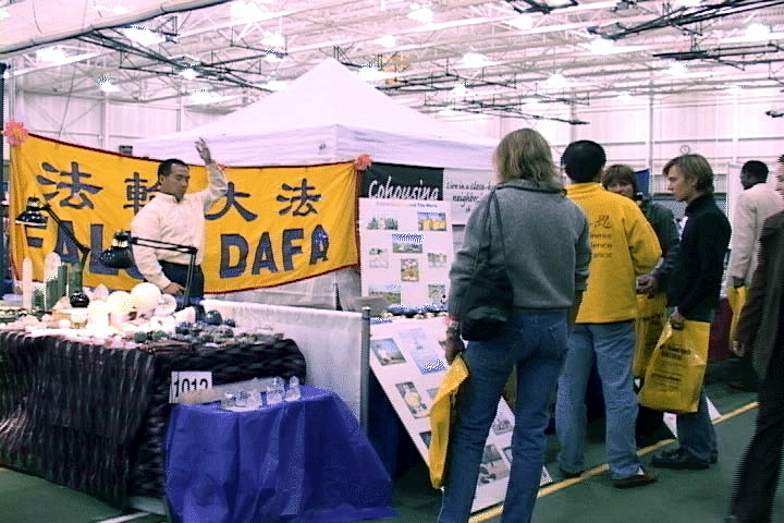 有一位美国人在经过我们的展位时,被播放中的李老师教功录像带与小朋友炼功海报所吸引而停住脚步,并向学员询问有关功法的很多问题。他对学员说:「中国政府的迫害是明显错误的,因为在中国有一亿人在炼,同时法轮功在全世界六十几个国家里,也有不少民众在炼。」