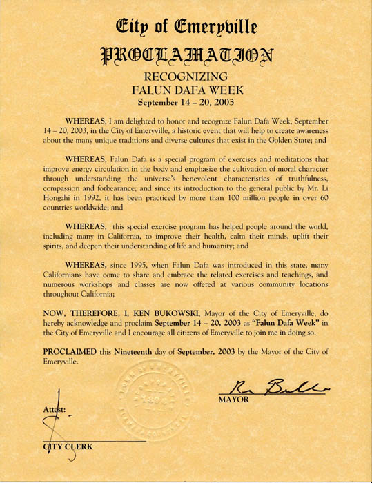 鉴于,我高兴地授予和公认2003年9月14日至20日为艾莫利威尔(Emeryville)市法轮大法周,这一具历史意义的事件将有助于引起人们对黄金州的许多传统和多元化文化的关注;并且