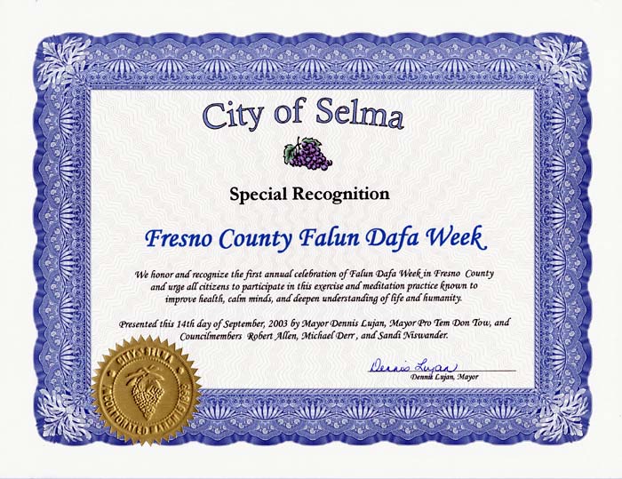 弗莱斯诺县“法轮大法周”我们高度评价和公认弗莱斯诺县第一次周年性的法轮大法周庆祝活动,并敦促所有居民参与这项以增进健康,平和心灵和深化对生命与人性理解著称的修炼和打坐功法。