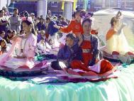有观众看到彩车上着唐装的学员炼功,跟朋友说:“打坐真美!”