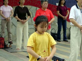 在第一阶段:功法展示---学员们身穿金黄色的炼功服,演示五套功法。舒缓优美的功法,祥和慈悲的能量场深深地吸引了过往的行人。有的人就坐在我们的展位前边看大法真相资料边看学员演示功法。有的人停下来拍照和录像。一个个路过我们展位的人都取了资料,又详细询问法轮功的功法特点,并提出要来学功。