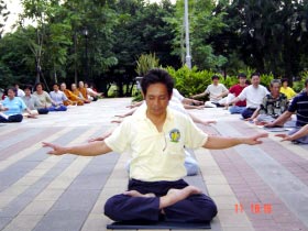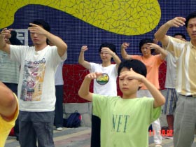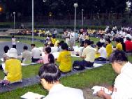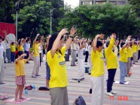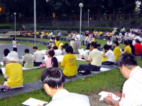 【明慧网2003年10月15日】今天(10月11日)的天气格外好,约200名来自台北县市各地的学员,下午四点齐聚在台北市荣星花园举行洪法活动。和煦的阳光照在荣星花园上显得更加的优美动人,来往的人们,花草、树木,一切都格外清新。学员们像以往一样,又一次向人们展示了法轮大法的美好。而不同以往的是,我们发现更多的人已认清了发生在中国的这场的邪恶本质,更多的人也从正面了解了法轮大法。