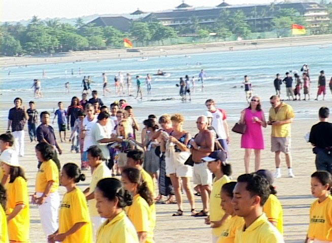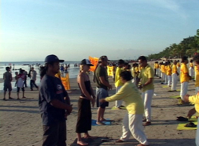 【明慧网2003年10月16日】10月12日,印尼巴里岛巴栋市政府外国人联合商会举行了一系列反恐怖和悼念一年前在爆炸中的死难活动,其中40多个团体组成的游行队伍环绕巴里岛的繁华路段游行4公里。在游行的队伍中出现了平和的法轮功队列,领头的是缤纷的花车,花车上有学员在打坐。在旁边看的人说:请安静,法轮功来了。这次活动除了游行外,印尼的法轮功学员还在海滩上炼功。祥和的场面引起来往人们的注意,有人当场学炼法轮功。