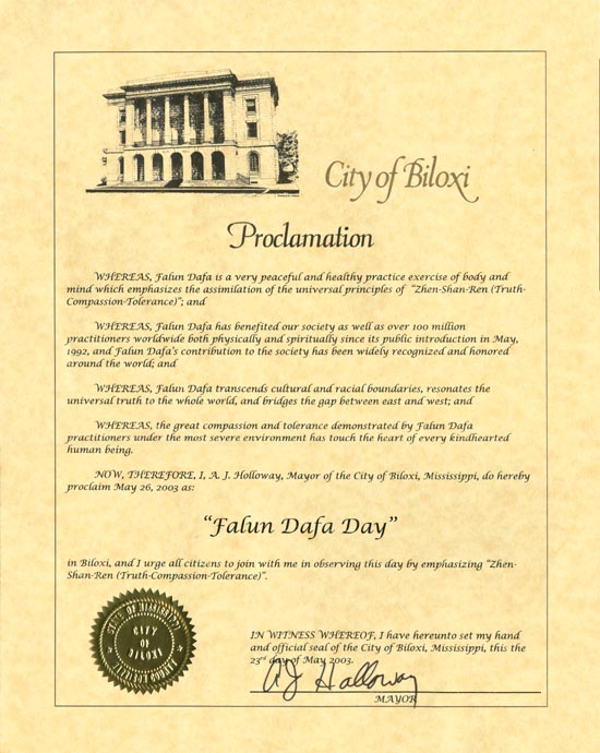 因此,我,密西西比州比劳克斯市(Biloxi)市长A-J-浩楼维(A.J. Holloway),在此宣布2003年5月26日为比劳克斯市