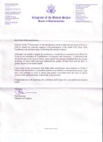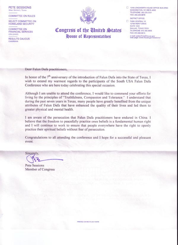 虽然我不能亲自参加会议,但我嘉奖你们努力按“真、善、忍”原则做人。我知道在过去的七年里,德州许多人已经从法轮大法中深深受益,法轮大法已经提高了他们的生活质量并增进了他们的身心健康。