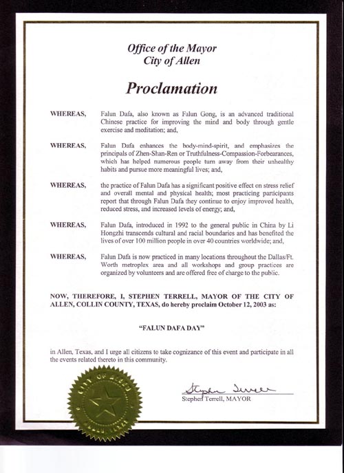 鉴于,现在达拉斯/福特-沃斯(Dallas/Ft. Worth)的许多地区都有法轮大法学员,而且所有的讲座和集体炼功都是由自愿者组织,免费提供给公众;